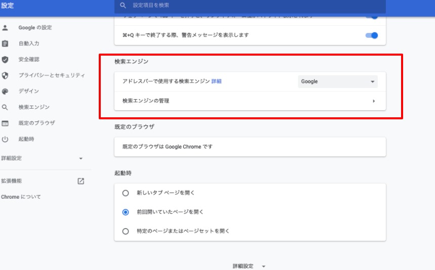 設定画面の中にある「検索エンジン」の箇所から、アドレスバーで既定に設定する検索エンジンを選べます。また、「検索エンジンの管理」をクリックすると、登録されている検索エンジンの一覧を確認することができます