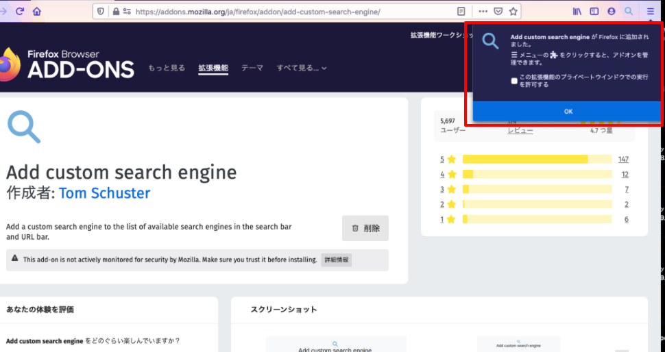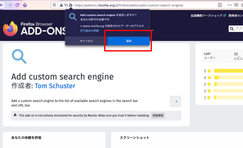「Add custom search engineを追加しますか?」という質問に対して、「追加」をクリックします。