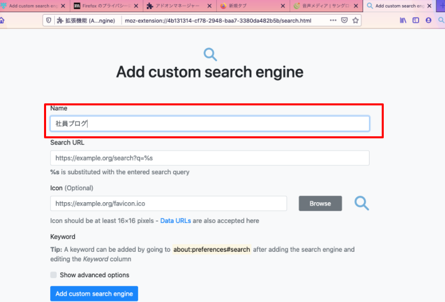 Add custom search engineの設定画面「Name」の箇所に作成したい検索エンジンの名前を入力します。例として、こちらの社員ブログ内の記事がすぐに検索できるように設置したいと思います。