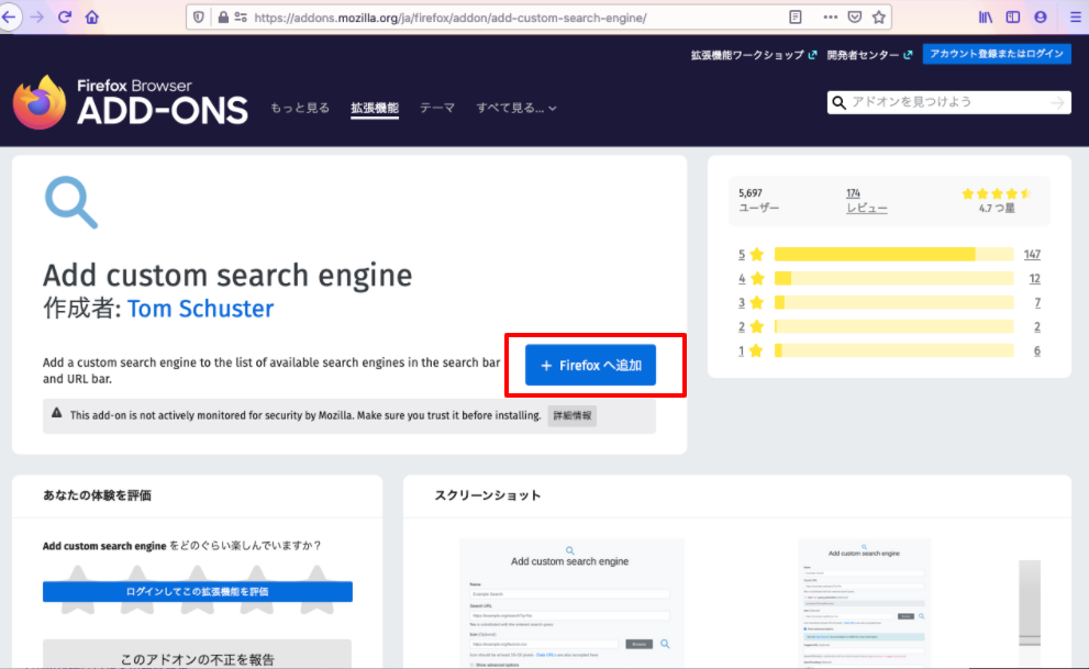 Firefoxをダウンロードしたら、Firefoxの検索バーから「Add custom search engine」を検索します。Add custom search engineのページを表示したら、「+Firefoxへ追加」をクリックしてください。