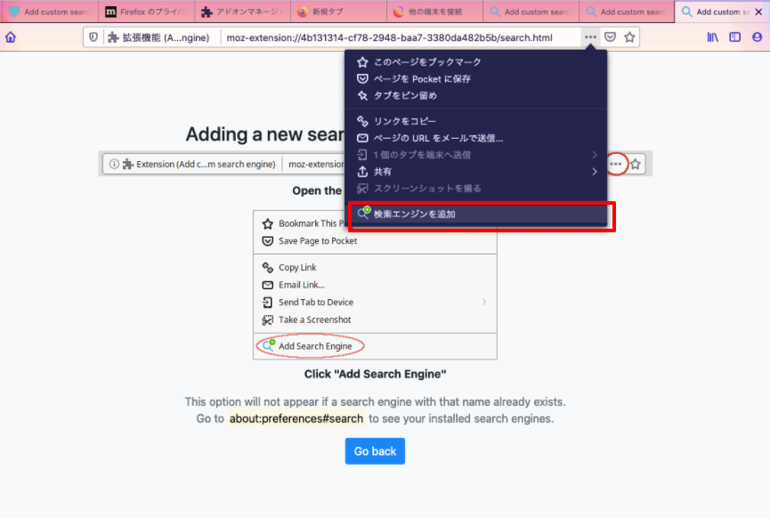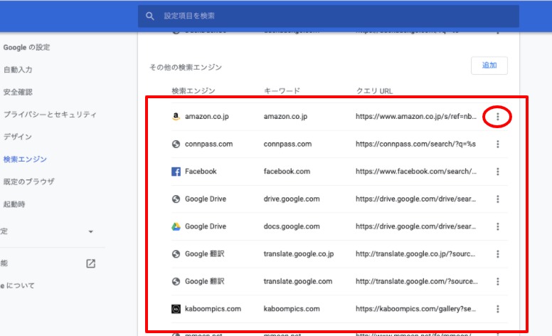 最後に赤枠内の「検索エンジンを追加」をクリックすれば検索エンジンの設定が完了です。
