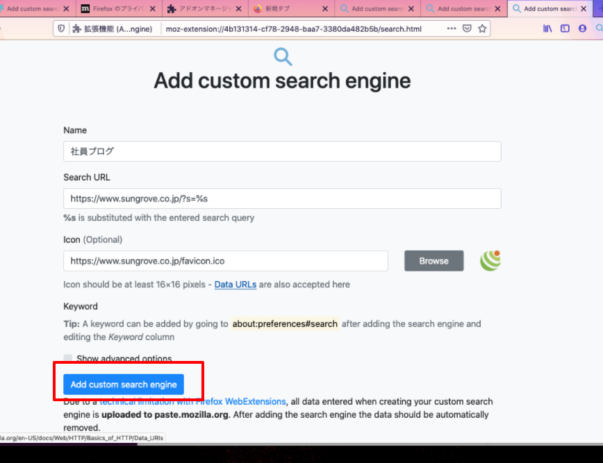 ここまで設定ができたら「Add custom search engine 」をクリックします。