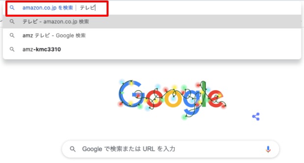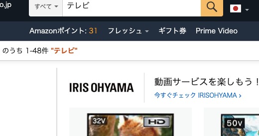 検索バーからEnterひとつで、amazon.co.jp内の「テレビ」というワードを含む商品が一覧表示されました!よく使う検索サイトは、このように設定しておくと非常に便利です。