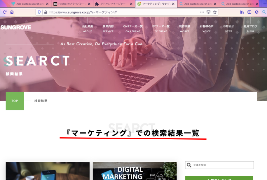 例えば、社員ブログ内でタイトルに「マーケティング」とつく記事を検索する場合、赤枠内のように「マーケティング」と入力、検索を行います。
