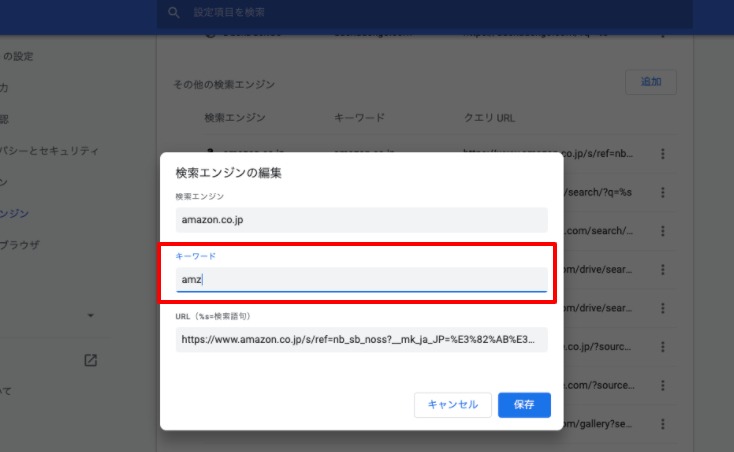 今回は、画像のように自動で登録されていた「amazon.co.jp」を「amz」とし、保存を行います。