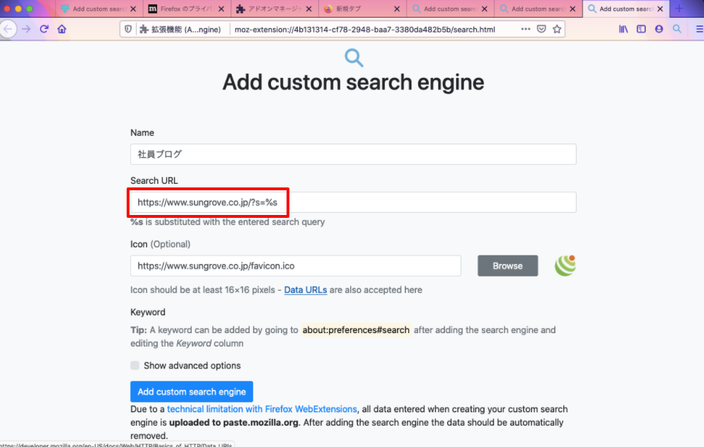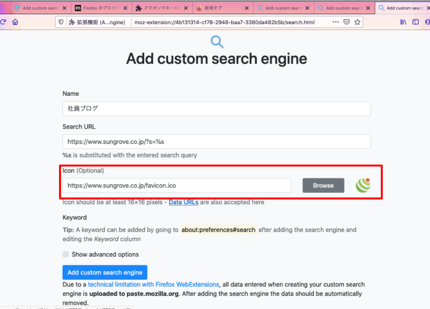 Search URLを設定すると「Icon」が自動で設定されますが、アイコンURLの設定は任意です。指定しなければサイトのfaviconがアイコンとなります