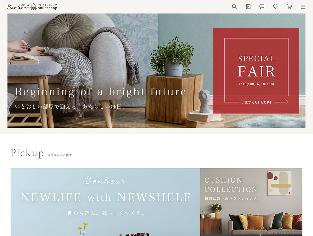 ファーストビューの直下に「特集商品」を配置しているため、売り出したい商品へとユーザーを効果的に誘導できます。