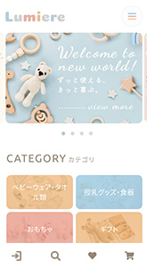 ベビー用品の販売を想定したテーマ。商品ページへのカテゴリーバナーを設置し、サイト内の回遊性を高めています。複数の店舗情報が掲載可能です。