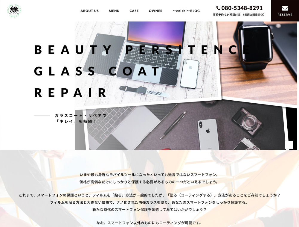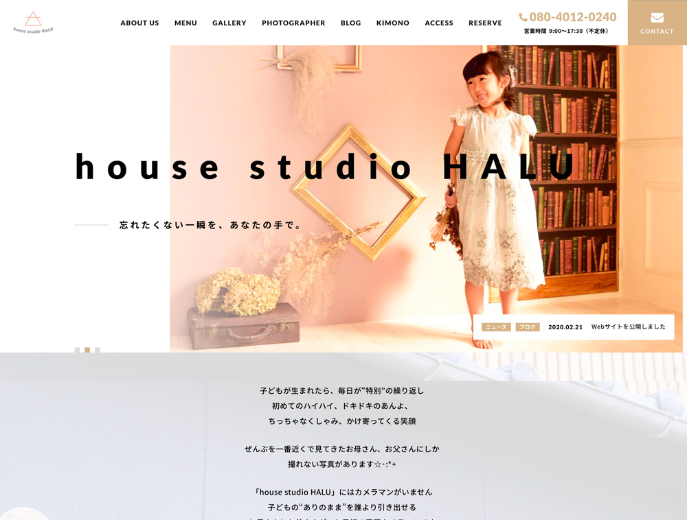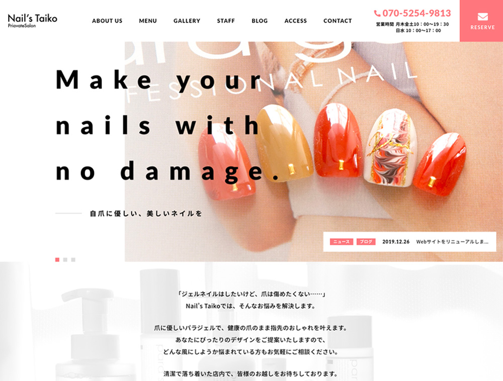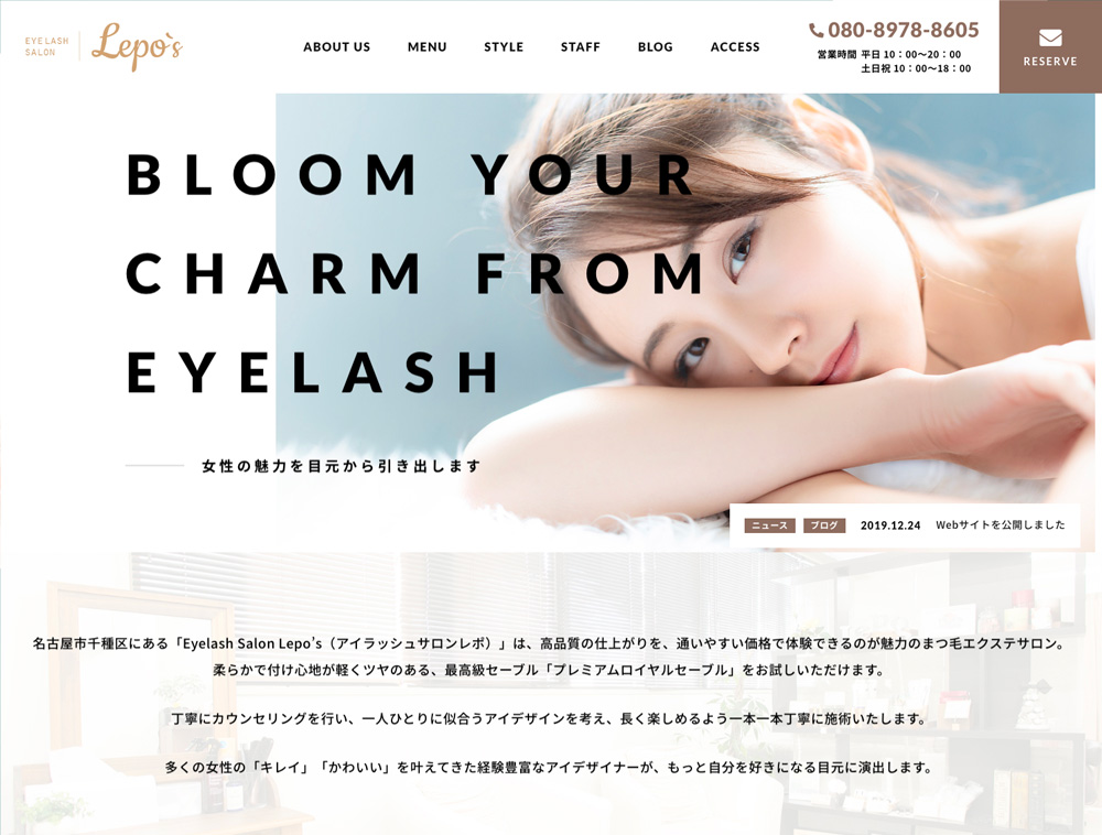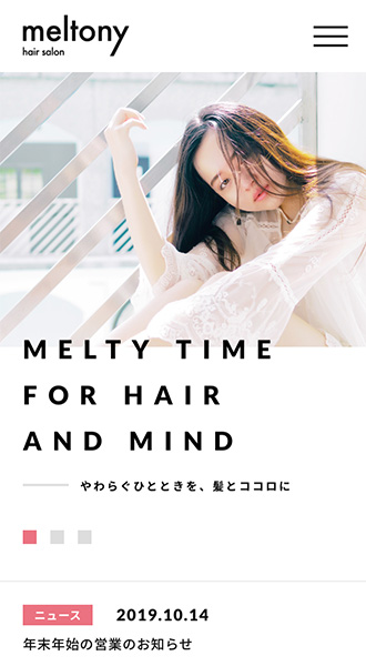 ヘアサロンやネイルサロンなど、美容メニューを扱う店舗様にぴったりのテーマです。なめらかな動きでフェードインする演出と、余白を贅沢に活かしたデザインが、サイト全体にスタイリッシュなポートフォリオのような印象を与えます。