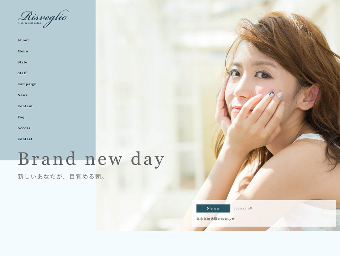 ヘア&ネイルサロンなど、複数のメニューを持つ店舗様に適した型番です。大きな写真や長いテキストが洗練されたデザインにまとめられており、コンセプチュアルな文章もしっかり載せられます。