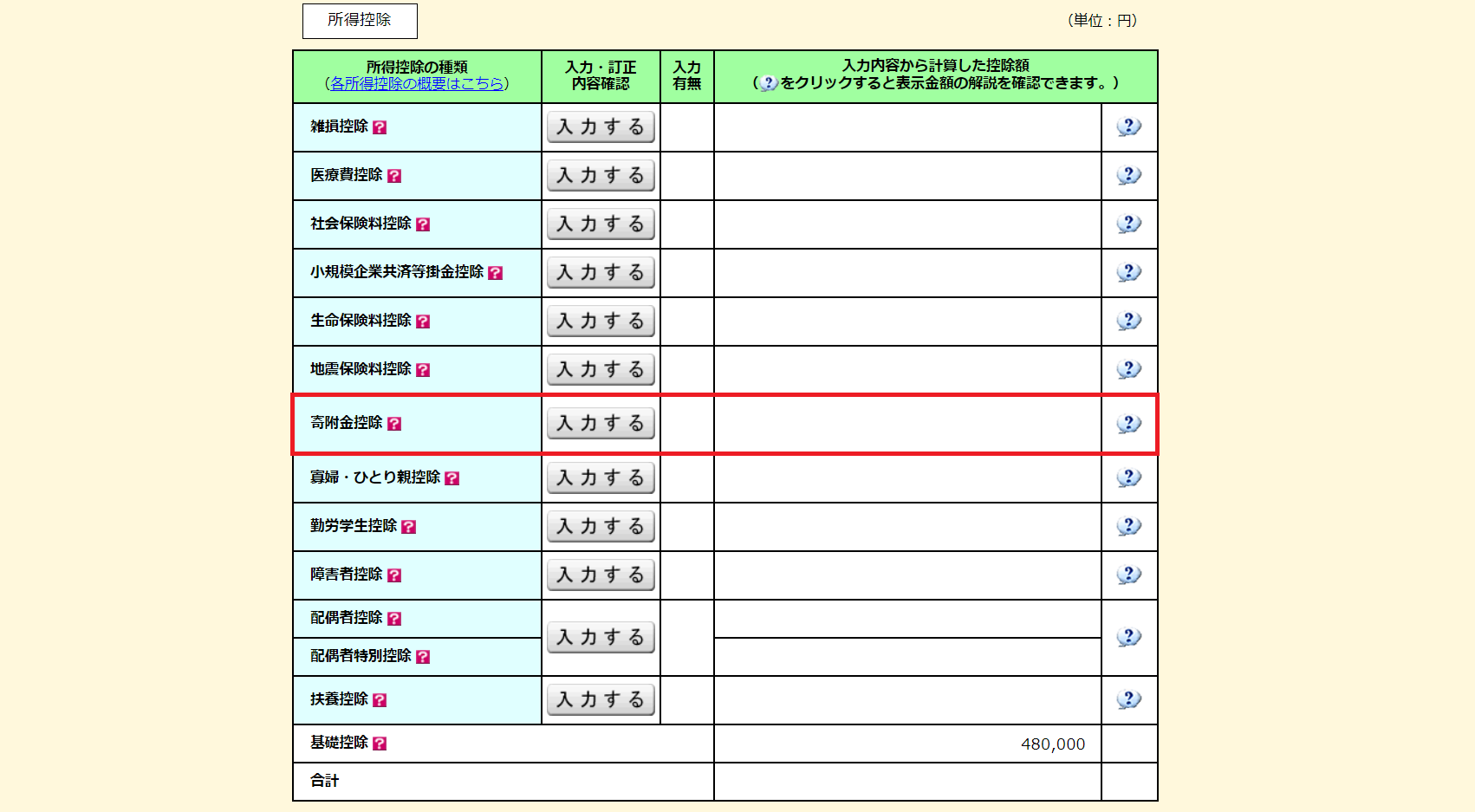 画面赤枠の「寄附金控除」の欄にある「入力する」をクリックします。