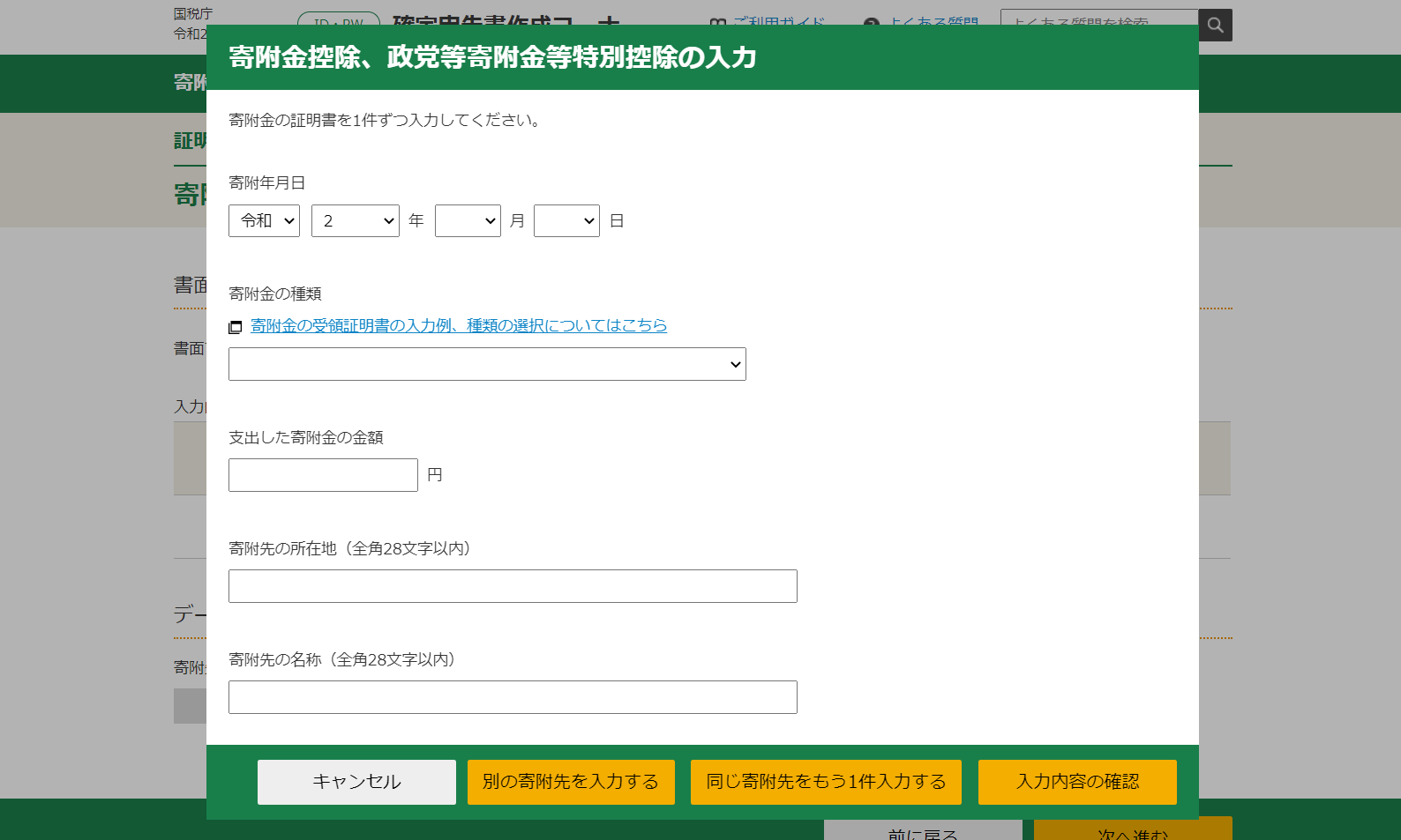 このような画面が表示されますので、「寄附金受領証明書」をもとに、寄附を行った日付や納税先の自治体、寄附の金額などを入力してください。