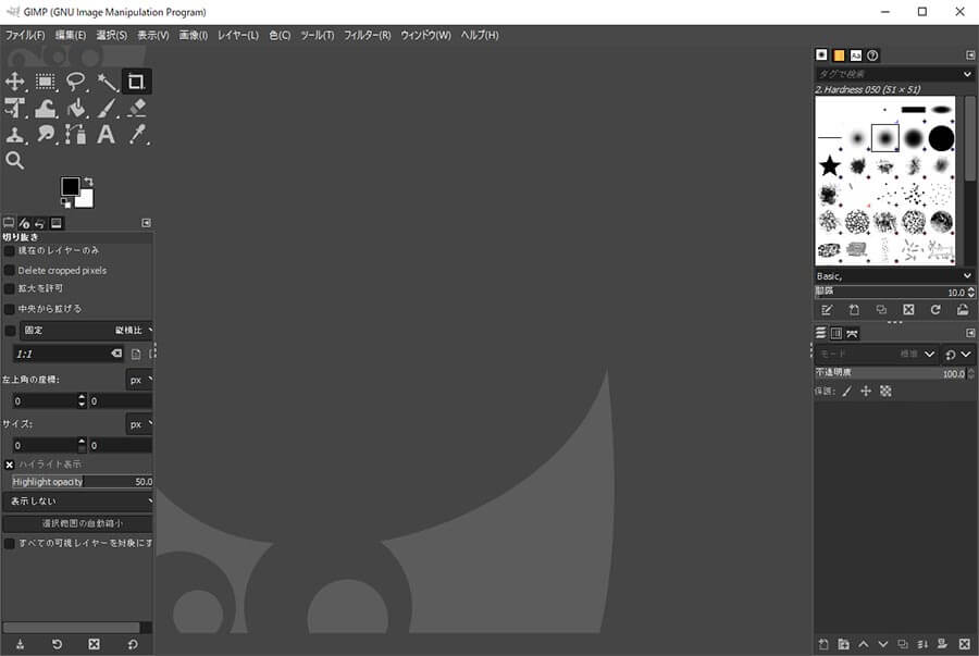 自動でソフトが立ち上がるわけではないので、スタート画面からGIMPを選択し起動してみましょう。起動後の画面が日本語になっているはずです。