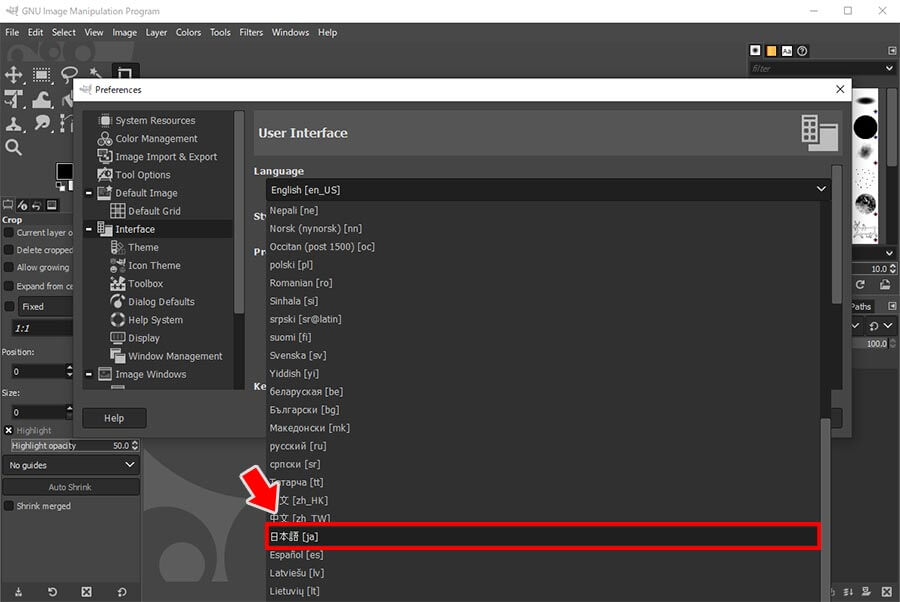 もし英語のままになっていたり、他言語になっていたりする不具合がある場合は、メニューバー上部にある「Edit(編集)>Preferences(設定)>Interface(ユーザーインターフェース)>Language(言語の設定)」から日本語 [ja]を選択してOKをクリック。GIMPを再起動をすると日本語になります。