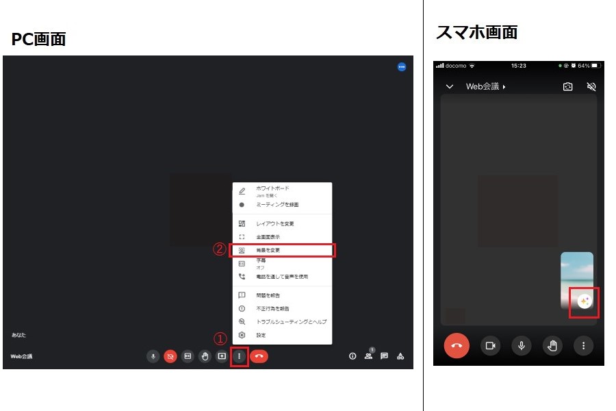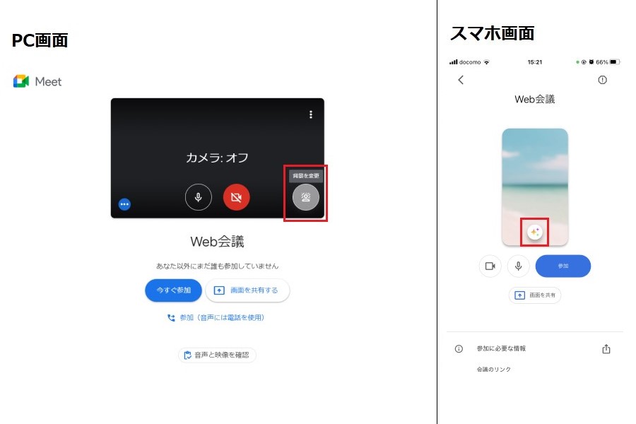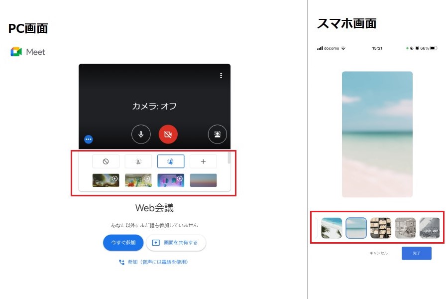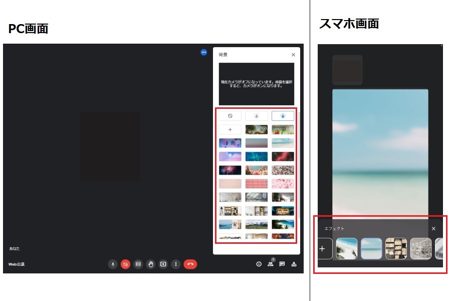 スマホの場合は、カメラをオンにしておかないと背景の変更ができないため、ご注意ください。
