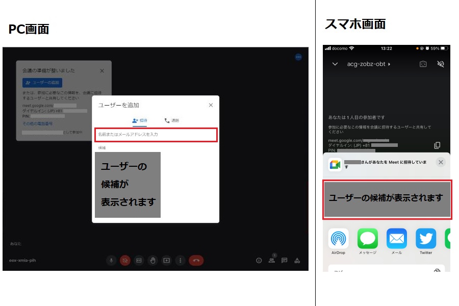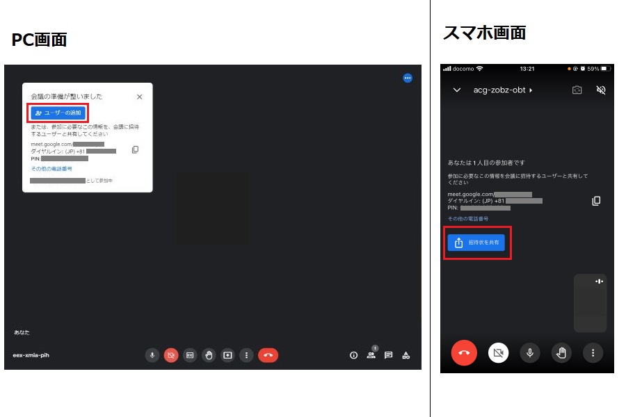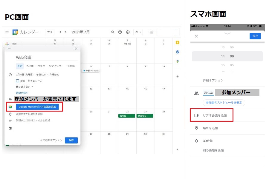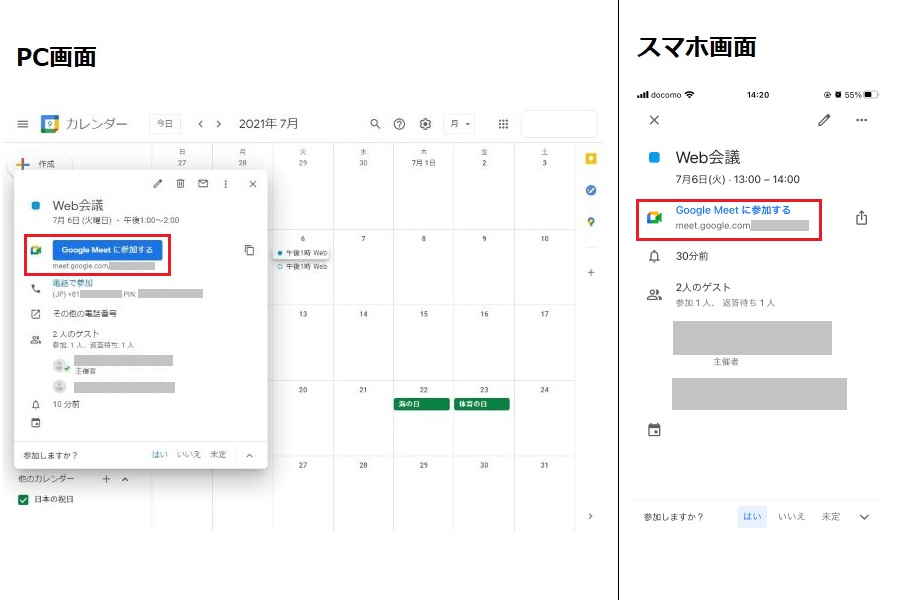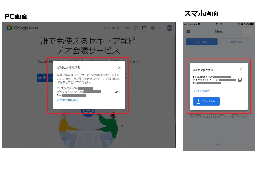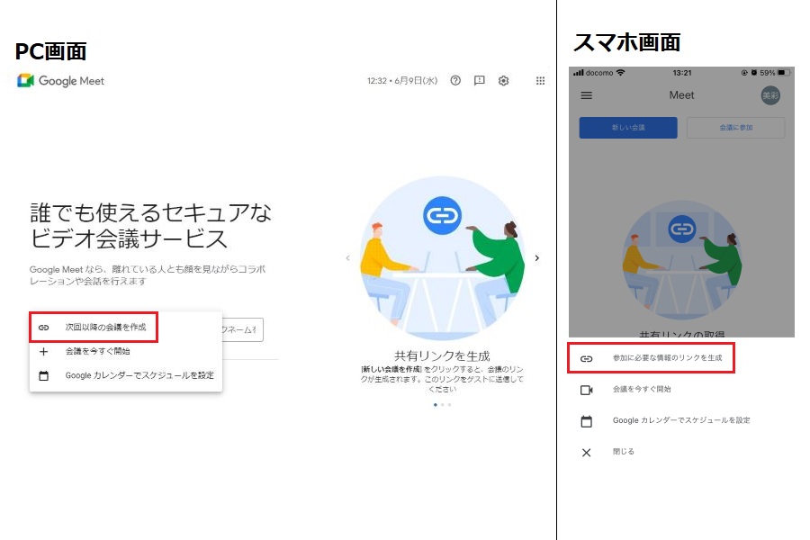 <注意点> パソコンはブラウザで起動できますが、スマホ、タブレットの場合はGoogle Meetアプリ(iPhone・iPad、Android)が必要なので、事前にインストールしておきましょう。 |