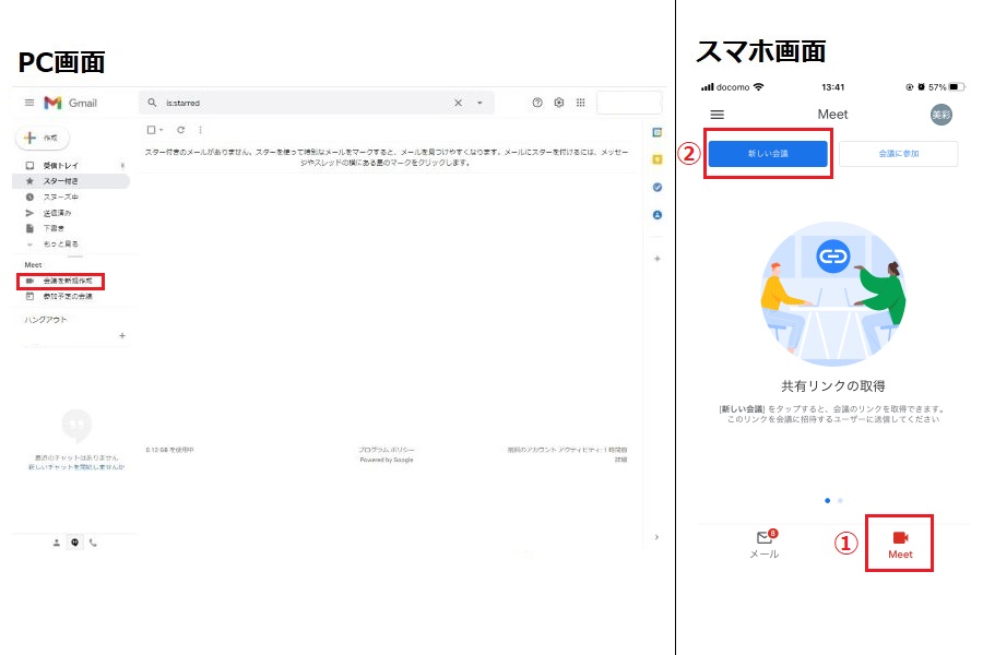 パソコンの場合は、左側にある「Meet」という項目から「会議を新規作成」を選択しましょう。スマホの場合は画面下にある「Meet」をタップすると自動的にGoogle Meetアプリが起動するので、「①Google Meetから開始する場合」と同じ手順で操作してください。