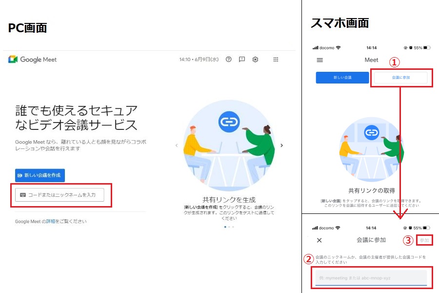 まず、Google Meetを開きましょう。パソコンの場合は、「コードまたはニックネームを入力」欄に会議コードを入力。スマホの場合は、「会議に参加」をタップしてから会議コードを入力してください。入力後に「参加」を押下すれば、会議準備画面が表示されます。