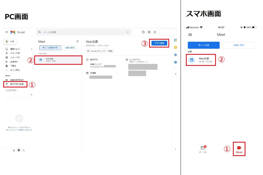 パソコンの場合は、「Meet」から「参加予定の会議」を選択。該当のWeb会議を選んでから「今すぐ参加」をクリックしましょう。スマホの場合は、画面下部の「Meet」をタップすると、予定されているWeb会議が表示されます。