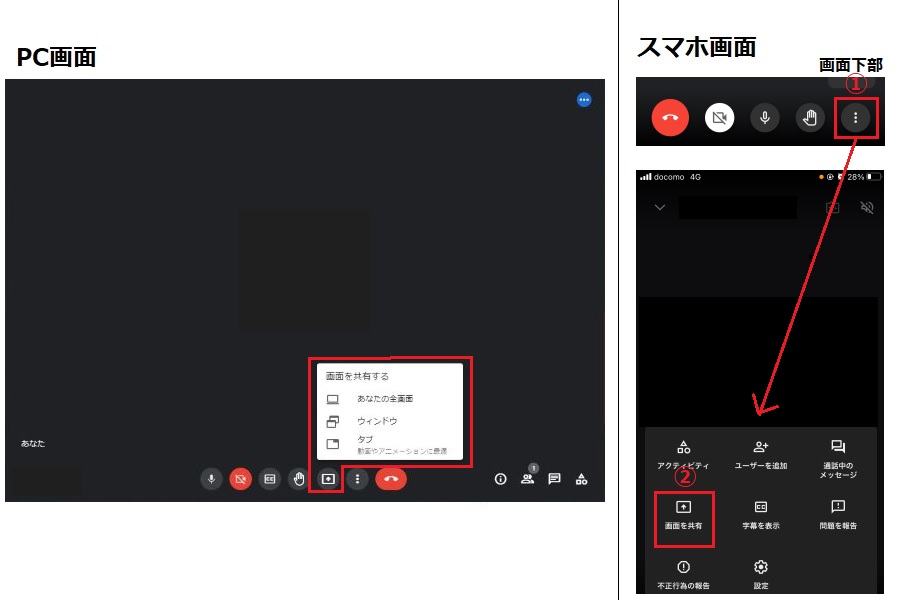 (1)会議画面で「画面共有」アイコンをクリックし、「あなたの全画面」、「ウィンドウ」、「タブ」の3種類から希望するものを選ぶ。スマホの場合は、画面下部の「詳細」アイコンから「画面を共有」をタップしてください。