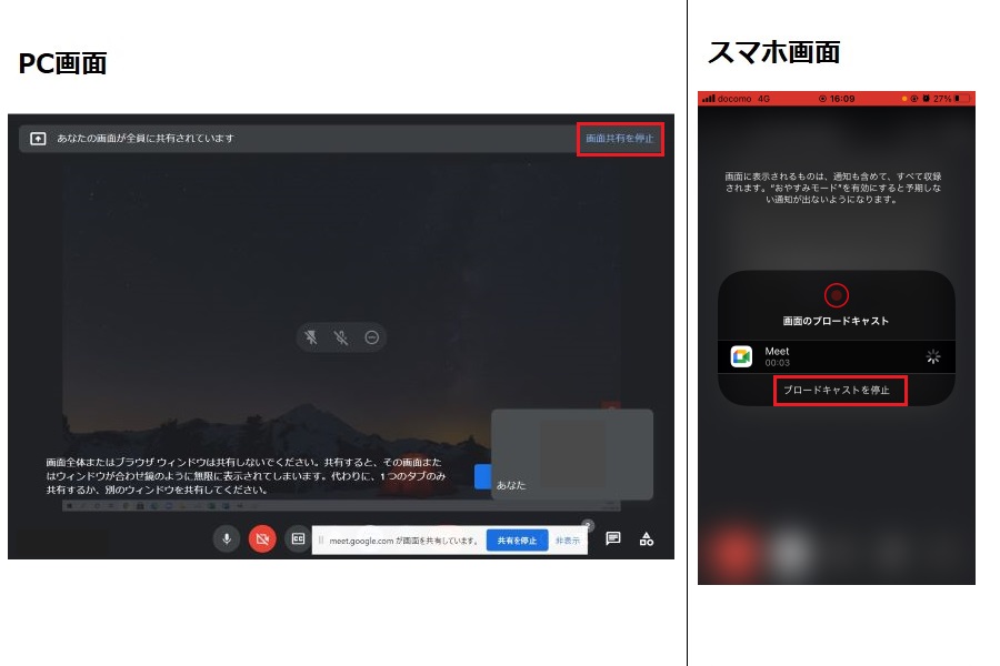 (3)画面共有を停止するときは、「画面共有を停止(またはブロードキャストを停止)」をクリックする。
