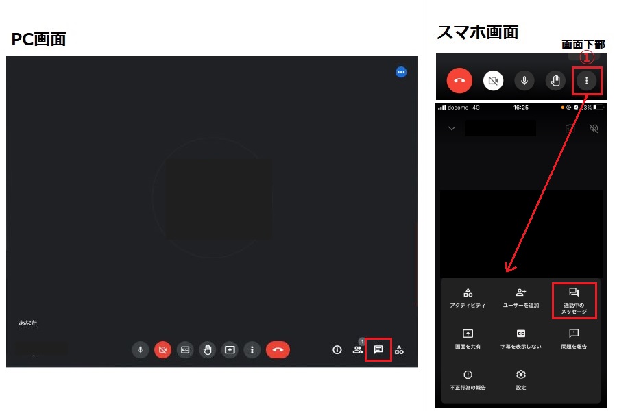 (1)会議画面で「全員でチャット」をクリックする。スマホの場合は「詳細」アイコンから「通話中のメッセージ」をタップしてください。