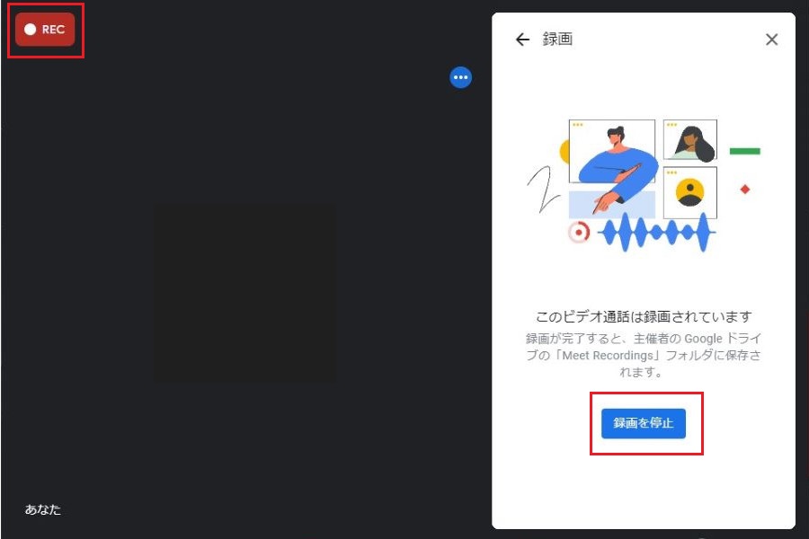 録画中は画面左上に「REC」と表示されます。録画を停止する場合は、録画詳細から「録画を停止」をクリックしてください。