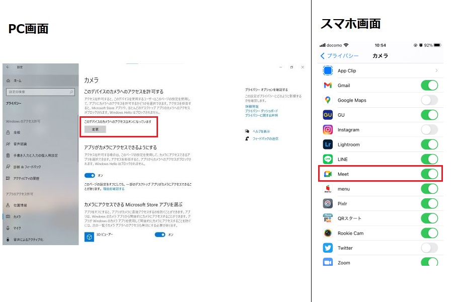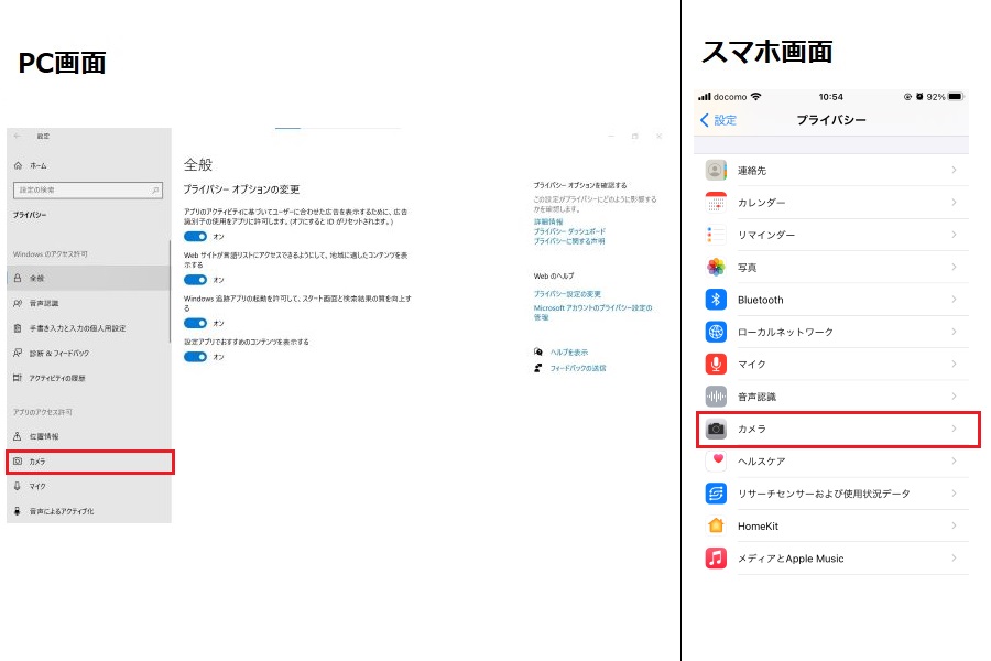 カメラに映らない場合、使用している端末のプライバシー設定がオフになっている可能性があります。以下の手順で確認してみましょう。