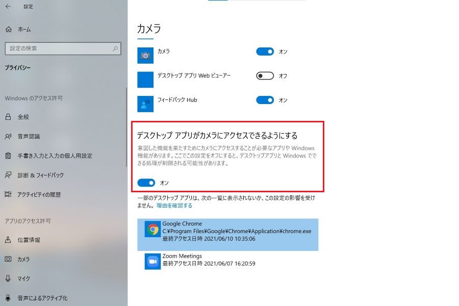 パソコンの場合は、「このデバイスのカメラへのアクセスはオフになっています」を「オン」に変更したうえで、同ページの下の方にある「デスクトップアプリがカメラにアクセスできるようにする」の項目も「オン」にしておきましょう。