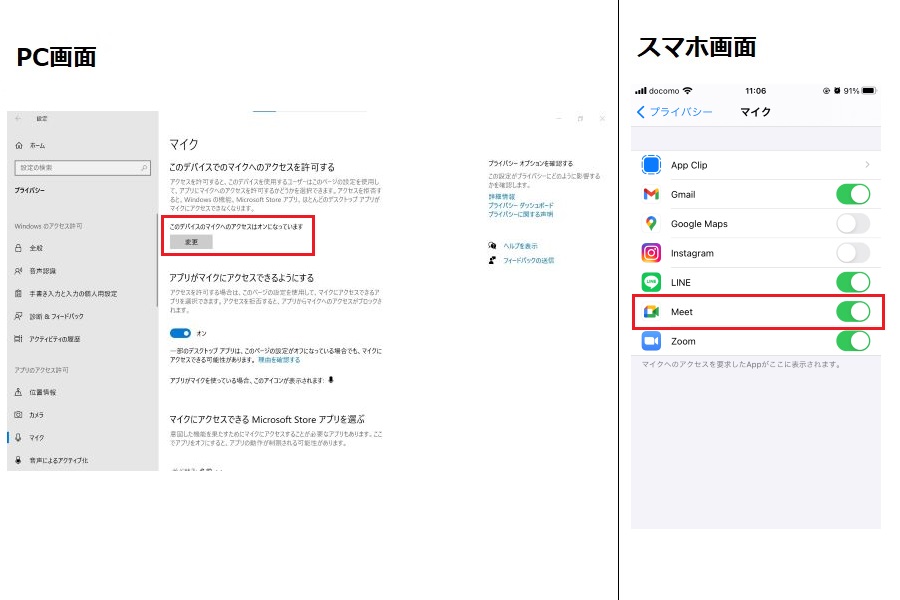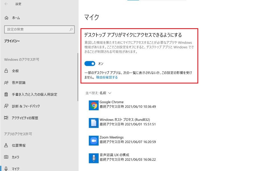 (3)マイクへのアクセスが「オフ」になっている場合は「オン」に変更する。