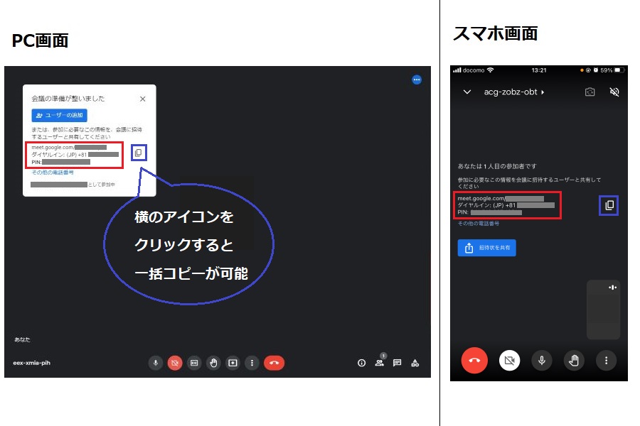 または、「一括コピー」アイコンをクリックして、会議情報を入手することも可能です。