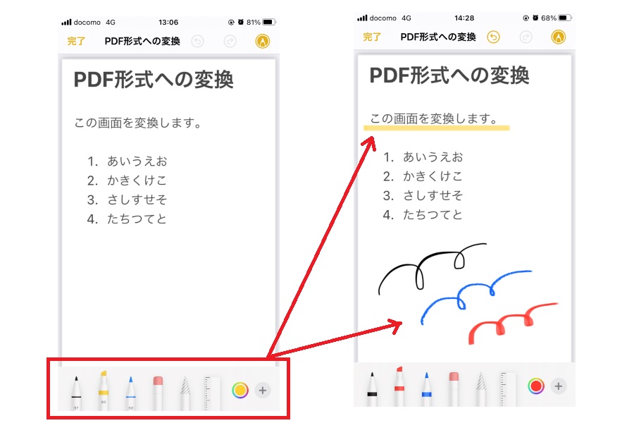 タップするとPDF形式への変換画面が表示されるので、内容に誤りがないか確認しましょう。このタイミングで、画面下にあるペンや定規を使えば、アンダーラインやコメントを手書きすることができます。