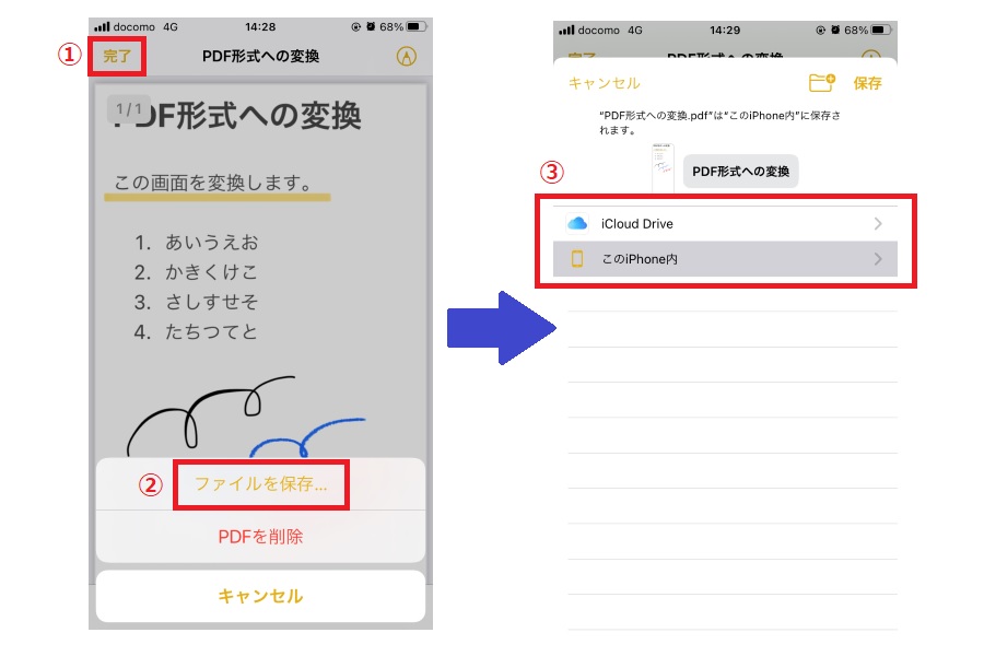 確認・編集が終了したら、画面左上の「完了」→「ファイルを保存」の順にタップして、保存先を選択しましょう。保存先は「iCloud Drive」か「このiPhone内」の任意のフォルダから選ぶことができ、保存したPDFファイルはApple純正の「ファイル」アプリで参照・編集できます。