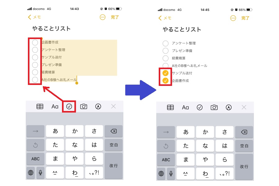 この状態でキーボード上の「チェック」ボタンをタップすると、文頭にチェックボックスが出現。これだけでチェックリストの作成は完了です。