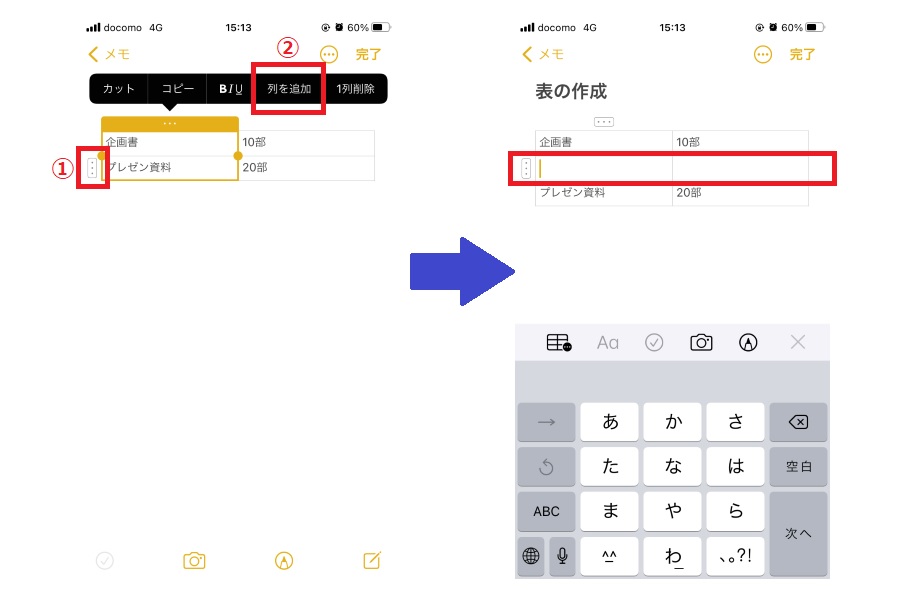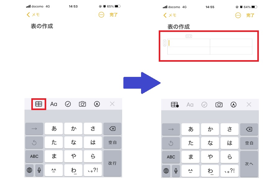 操作はとても簡単。メモ画面の「表」ボタンをタップするだけで2×2の表が挿入されます。
