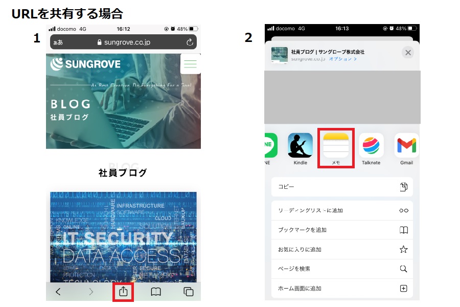 URLの共有は「Safari」アプリを、地図の共有はApple純正の「マップ」アプリを使用しましょう。また、「共有」ボタンはアプリによって配置場所が異なりますが、デザインは同じなので、画面上で探してみましょう。