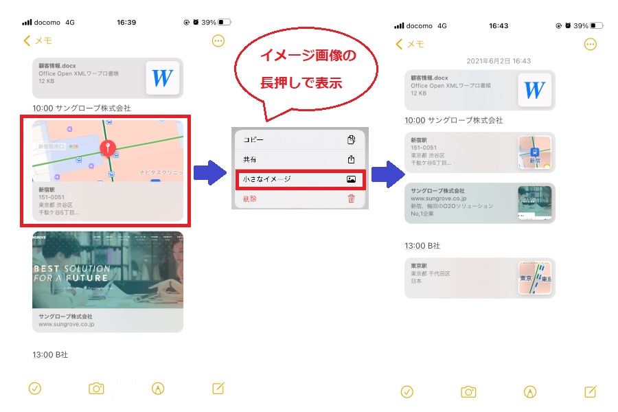 また、メモ画面上のイメージ画像が大きく見づらい場合は、長押しでポップアップウインドウを表示して「小さなイメージ」を選択すると、簡素化されて確認しやすくなります。