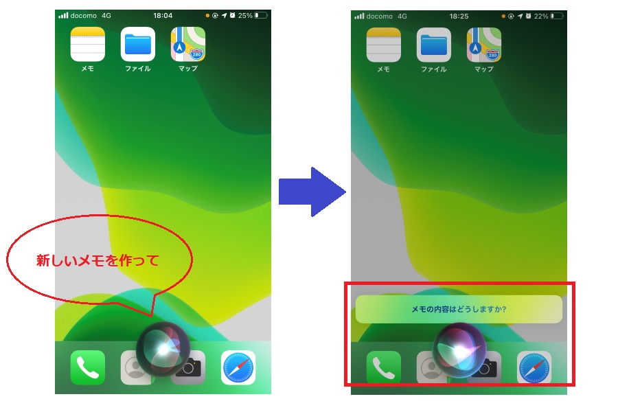 方法2はSiriを起動してメモしたい内容を話すだけなので、手が離せないときや運転等で画面操作が難しいときでも簡単にメモを作成することができておすすめです。