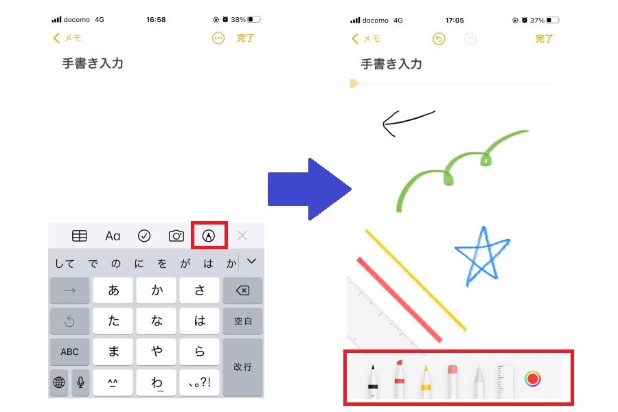 メモ画面の右下にある「鉛筆」ボタンをタップするとフリーハンド機能を利用できます。