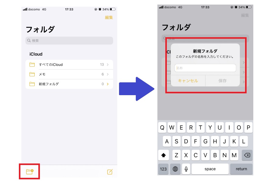 メモアプリのトップページで、左下の「フォルダ」ボタンをタップするだけで新規フォルダを作成できるので、手軽に整理整頓できますよ。