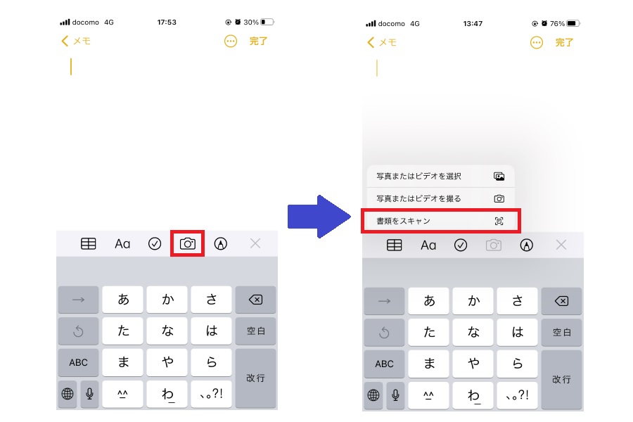 そんなときに活用できるのがスキャン機能です。特別な機械は必要なく、メモアプリのカメラで紙の書類を撮影するだけでOK。iPhone一つで簡単にスキャンをとることができます。