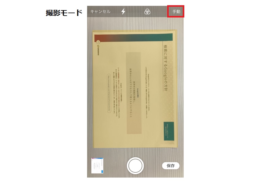 なお、今回は手動撮影にしていますが、右上の「手動」ボタンをタップすれば自動撮影に切り替えることができます。手動撮影は自分でシャッターを押す必要がありますが、自動撮影はカメラが撮影対象を認識した時点で勝手にシャッターを押してくれるので便利です。
