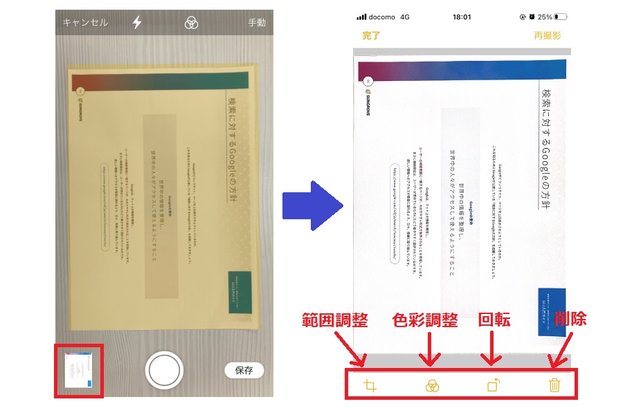 撮影された画像は画面左下に表示されます。この画像をタップすると、範囲調整や色彩調整、反転などの加工ができるようになります。