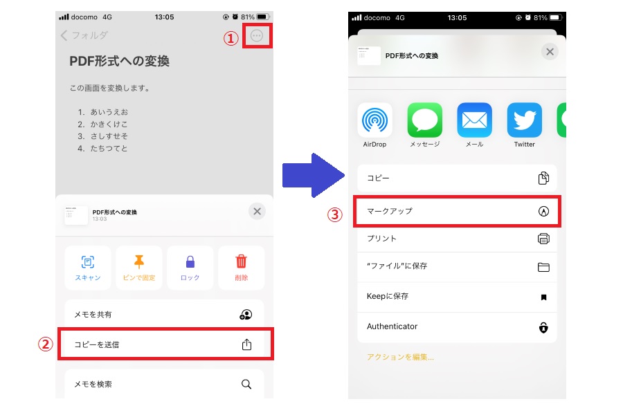 まずは、PDF化したいメモを開き、画面右上の「詳細」ボタンをタップ。その後、「コピーを送信」→「マークアップ」 の順にタップしてください。