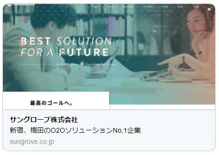 TwitterでURLがシェアされたときの表示形式を指定できます。指定なしだとリンクはURLがテキストで表示されるのみですが、Twitterカードを指定していると、アイキャッチとタイトルを自動で表示してくれます。
