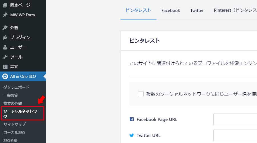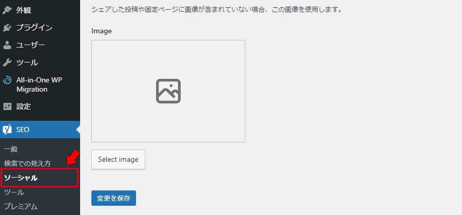 1、Yoast SEOの「ソーシャル」のメニューから、Facebook・Twitter・Pinterestのデフォルト設定が可能です。