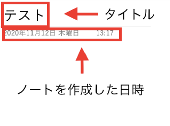 ノートのページは上記図のように「タイトル」「ノート作成日時」そしてその下の空白部分が「本文」という並びになっています。ノートを作成した日時が細かく表示されるので、あとで探す際にも便利です。そして本文を選択すると下のような四角い箱が表示されます。