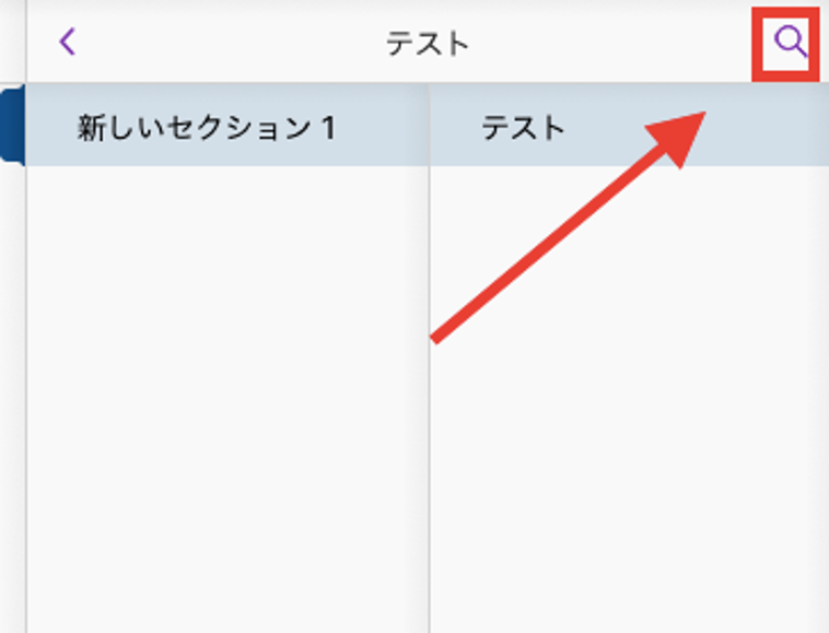 ノートやページが増えてくれば、知りたい情報を瞬時に取り出すことが困難になります。その場合は、該当する項目を検索することができます。検索は左のセクションタブから右上にあるルーペを選択し行います。