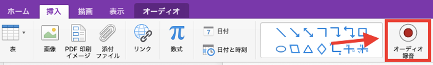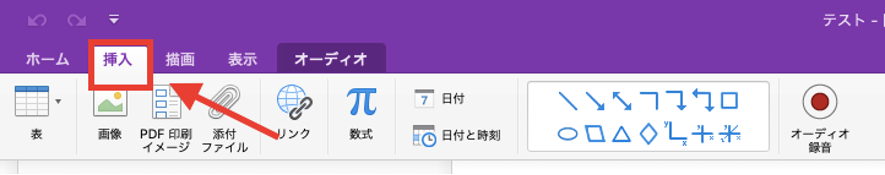 OneNoteにはオーディオ録音機能があるので、メモを取りながら録音することもできます。録音を行う場合はメニューバーの「挿入」を選択し、続いて「オーディオ録音」を選択します。