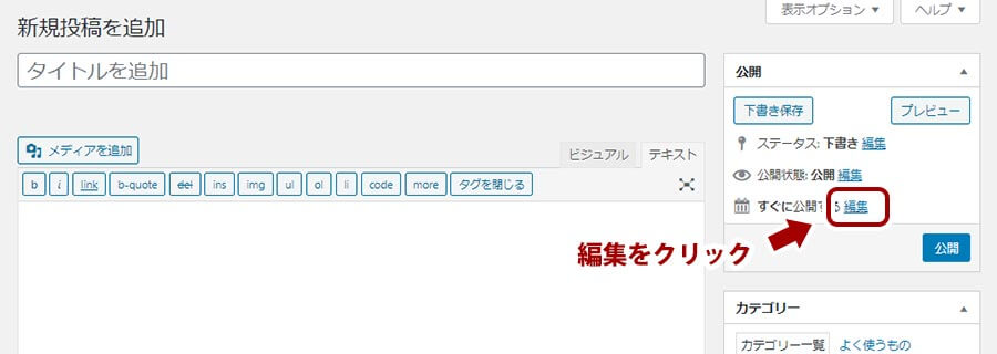 1、Wordpressの投稿画面の右サイドバーにある、「公開」→「すぐに公開する」の右にある『編集』をクリックします。